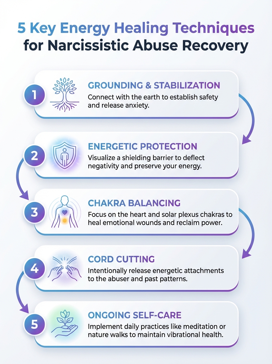 An at-a-glance guide to five practical energy healing techniques that support recovery from narcissistic abuse.