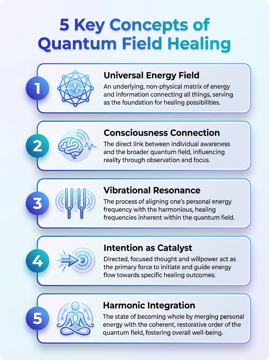 Visual guide to the five core ideas behind quantum field healing. See how energy, resonance, and consciousness interact.