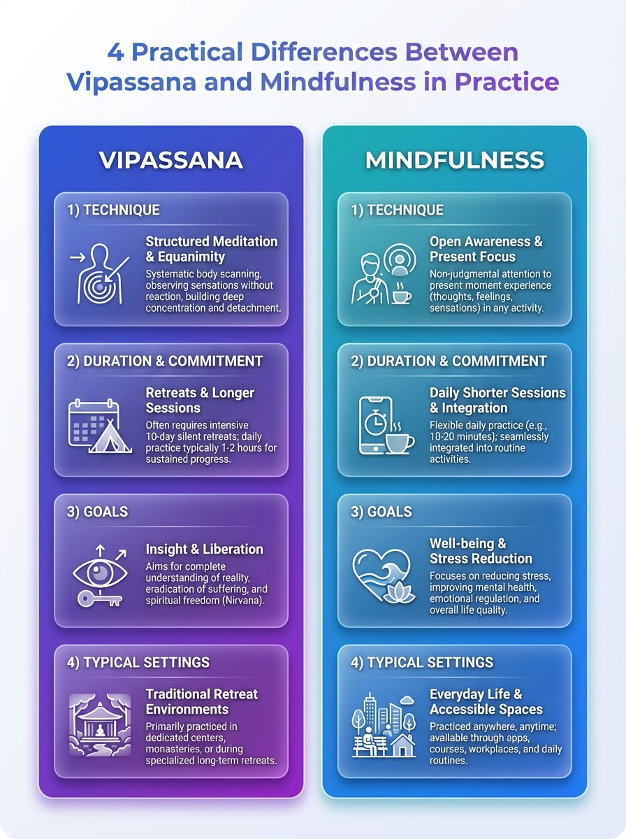 A side-by-side look at Vipassana and Mindfulness. It highlights four practical differences in how they are practiced.